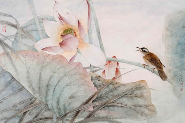2、通过“技法”表现工笔花鸟 传统工笔画中常见的技法有勾勒、填色、晕染、没骨、撞水撞粉等,没骨是直接用墨来描绘物体,因此具有细腻轻快和谐的效果。例如之前提过的苏百钧《晚风》,整体青蓝色的色调得给观者强烈的视觉冲击,但又不会显得突兀,相对于传统工笔画有了较大的创新。 画家为了表达出这幅画的意境,将泼墨这一技法在这幅画中运用的淋漓尽致,营造出了一种晚风吹拂带给人清凉而又安宁的感觉,使其更好地表达了画家的思想感情。 随着工笔画的发展,写意性这一特点在画家创作中占据着越来越重要的地位。它不仅要求画家具备一定的绘画基础,通晓造型塑造等画理,还得学会用心去感受外界,在有了所想要表达的意之后用画来表达自己内心的主观情感,而这时物象也只是作为一个画家内心思想的一种媒介罢了。现代工笔画相对于传统工笔画不管是在线条、构图、上色、还是技法上都有了重大的进步,比如在线条上并不仅仅是单一的描物,色彩上也不是随类敷色的上色等等,不管是在哪个方面,所围绕的主题都在于画家的意上面。要想让自身作品得到提高,就要学会与不同的绘画创作思想进行沟通,碰撞接洽,同时在现代工笔花鸟画中,要学会注重客观事物的表达和自身内心所想要抒发的意的描绘。作为一名绘画者,我已然清楚了解到画中写意性的重要性,绘画中不能仅仅只是对物象的模仿与照本宣科,更要学会通过这一物体来向观者传递自己所想要表达的感情以及自身主观意识的表达,学会不是为了画物而画物,而是为了画意而画物。 |